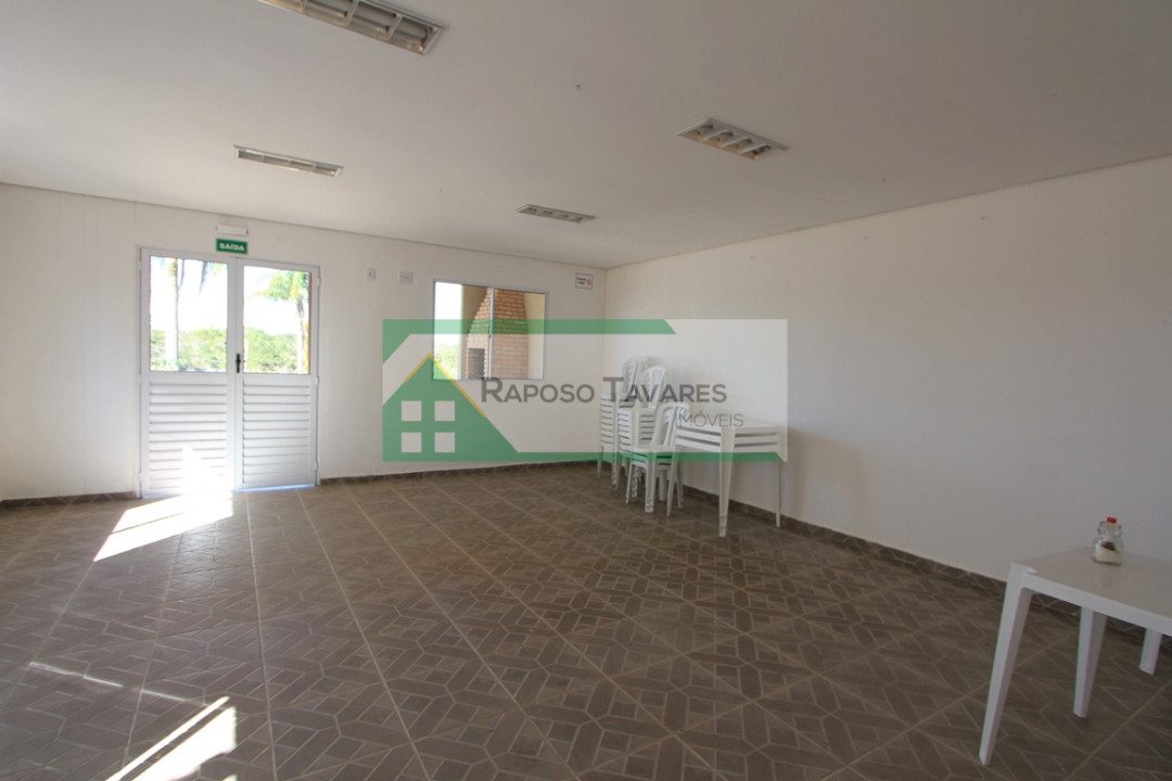 Amplo e arejado salão de festas com churrasqueira.